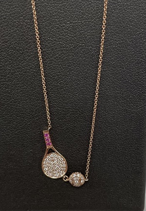 Available now, these one of a kind Diamond Tennis racquet & ball necklaces in 14K yellow or rose gold, featuring pink sapphires and 0.25 carats of diamonds.