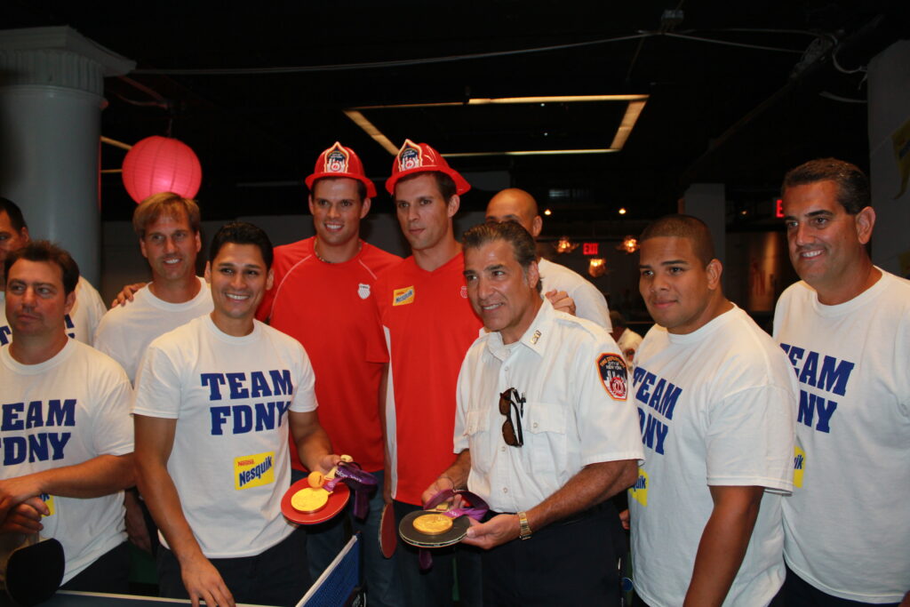 Identical twins and world champion tennis players Mike & Bob Bryan are recent gold medalists and have racked up 11 Men’s Doubles career Grand Slam Titles and 61 overall titles. In late August, they went head-to-head with a team of unlikely, but worthy, opponents … firefighters from FDNY’s esteemed units in all five boroughs. Unlike the Bryans, recent matches in London, the pros this time met New York’s bravest on a different type of “court” – the table tennis court, as part of a ping-pong charity tournament hosted by NESTLÉ NESQUIK.