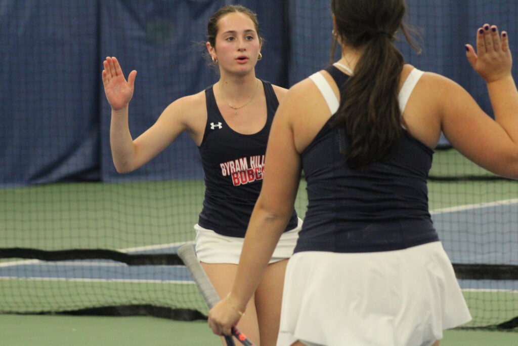 Byram Hills got a first singles victory from Jenna Kleynerman, who held on to win 6-3, 3-6, 6-2. At second doubles, Dani Goldman & Jordyn Bernstein were 6-1, 7-5 winners, while the third doubles tandem of Eliza Moy & Anisha Bobra won 6-3, 6-4.