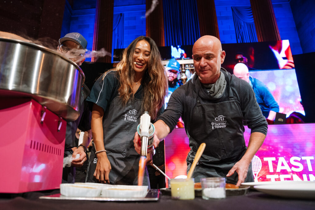 DJ Irie brought the energy, while tennis icon Andre Agassi took on the role of judge for an engaging cooking demo. Executive Chef Cedric Tovar of The Palace Lotte Hotel guided Olympic gold medalist, Qinwen Zheng and American #1, Taylor Fritz through crafting a delectable dish, blending culinary skill with sportsmanship for a truly memorable evening.