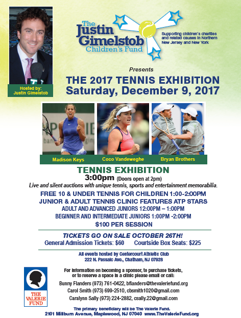 The Justin Gimelstob Children’s Fund will be holding The 2017 Tennis Exhibition on Saturday, December 9, as Madison Keys, Coco Vandeweghe and the Bryan Brothers will be on hand for the day at Centercourt Athletic Club in Chatham, New Jersey.