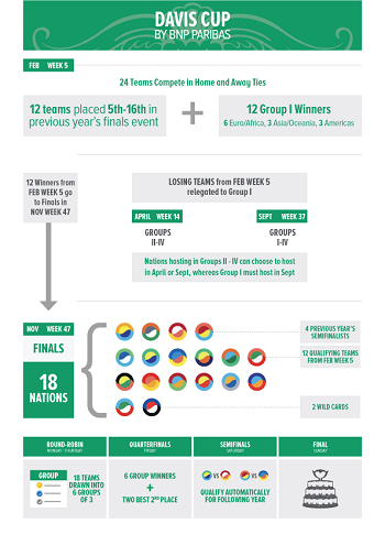 Beginning in 2019, the Davis Cup will feature a qualifying round in February where 24 teams will take part in home and away matches. The 12 winners will then advance into the final and join the four semifinalists from the previous year, and two wildcards that will  be announced before the qualifying round.