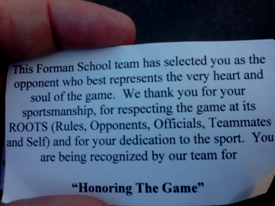 As mentioned before, if you are able to frame success as effort and sportsmanship, those behaviors need to be reinforced. By recognizing sportsmanship award winners, you are fully reinforcing the message of culture to your players. Recognizing sportsmanship and effort is another way to de-stress the competitive experience because players realize that their success depends on factors they can control. Below is an example from The Forman School in Litchfield, Conn. With their “Honoring the Game” Award, which recognizes one member of their opposing team that best exemplifies good sportsmanship, respect and dedication to tennis.