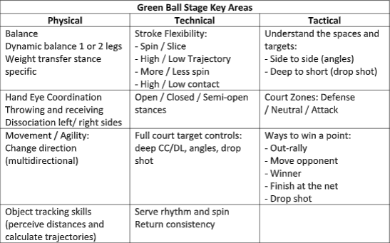 The transition to Green Ball brings the obvious full-court size with the low compression balls; the key tactical element in this stage would be to master the usage of the spaces both from side to side and deep to short. It is also important at this stage to get a basic understanding about court position and how it is connected to the tactics.