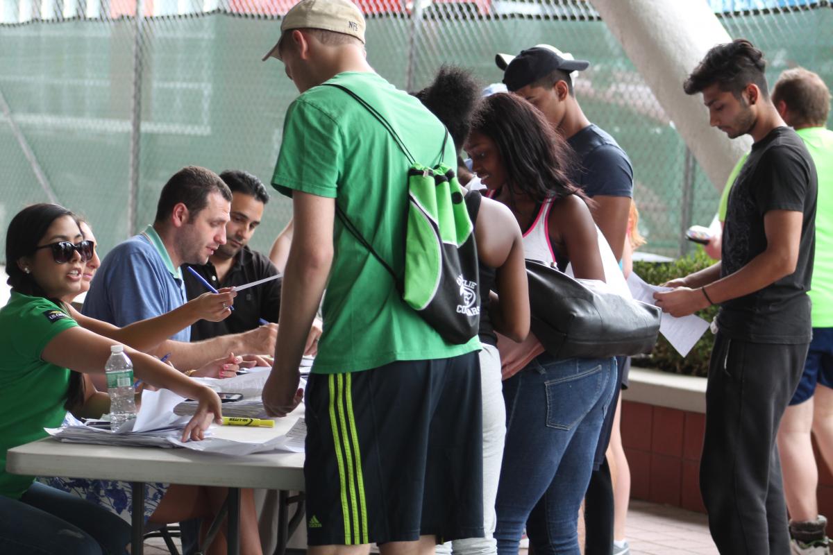 In late June, the 2015 U.S. Open Ballperson Tryouts were held at the USTA Billie Jean King National Tennis Center, and were open to prospective ballpersons 14 years of age and older. To begin the afternoon, optimistic ballpersons patiently stood on line to register and try out for one of the 80 open ballperson positions. As registration concluded, candidates rushed through the U.S. Open gates and continued onward to the outer courts to receive further instruction. After all ballpersons arrived, U.S. open staff told them which courts they will be trying out on.