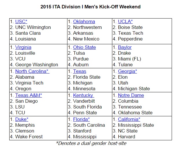 The ITA Kick-Off Weekend sends three visiting schools to a host site for a four-team tournament. The host school faces the number four seed and the number two seed plays the number three seed. The winners of those matches will come back the following day with a ticket to the 2015 ITA National Team Indoor Championships at stake, and the losers compete in a consolation match. A total of 22 universities will host this year's ITA Kick-Off Weekend, with eight schools hosting both men's and women's events.