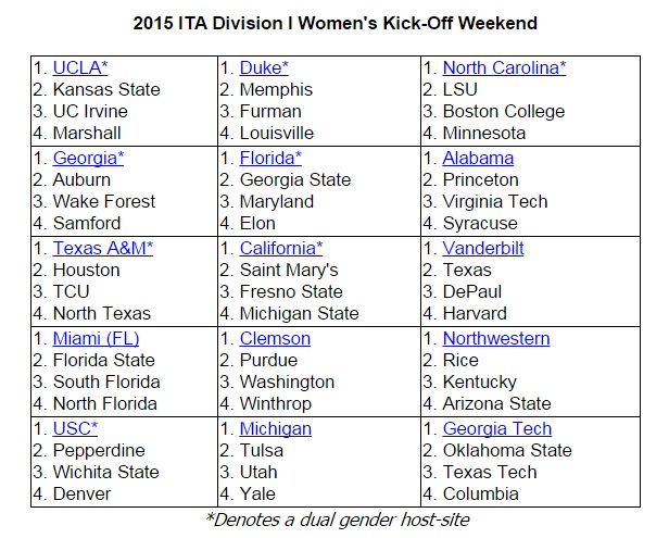 The 2015 spring season shifts into high gear on Jan. 23-25 for the Seventh Annual ITA Kick-Off Weekend. One-hundred-twenty teams—60 men's and 60 women's—will compete across the country for berths in the ITA National Team Indoor Championships in February. The ITA Division I National Women's Team Indoor Championships will be hosted by the University of Virginia at Boar's Head Sports Club in Charlottesville, VA, while the ITA Division I National Men's Team Indoor Championships will be hosted by the University of Illinois at Midtown Athletic Club in Chicago.