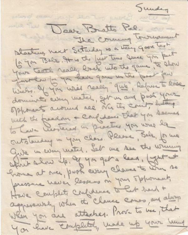 The coming tournament starting next Saturday is a very good test for you Babe. It is the first time since you put your teeth really back into the game, to show just how far you have gone in the past few weeks. If you will really "give,” refuse to lose, dominate every match, get in and push your opponents around all over the court, hitting with the freedom and confidence that you seemed to have mastered in practice, you will be outstanding in your class.