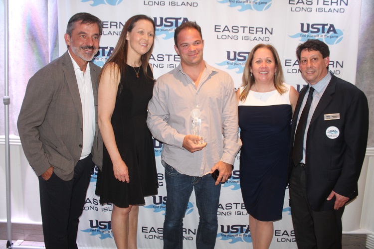 RSTA Tennis Director Vinicius Carmo (center) accepts the Tennis Club of the Year Award at the recent USTA Eastern LI Region 28th Annual Awards Dinner from tennis greats Emilio Sanchez, Liezel Huber, USTA Eastern Executive Director and COO Jenny Schnitzer, and USTA Eastern Long Island Region President Jonathan Klee.