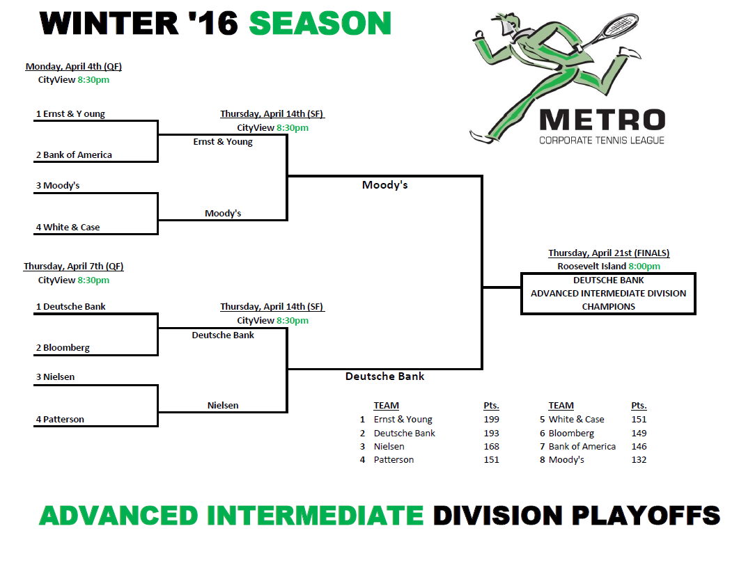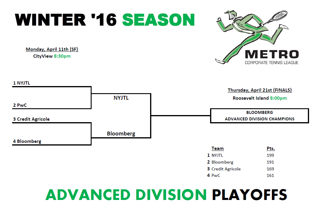 The Winter 2016 Season wrapped up on April 21 where the finals took place for the Advanced Intermediate & Advanced Division. The entire club was rented to have a fun night of tennis, food, music, a caricaturist and drinks! Bloomberg LP defeated NYJTL to grab the Winter Advanced Division trophy, while the team from Deutsche Bank won the Advanced Intermediate Division against a strong Moody’s team.