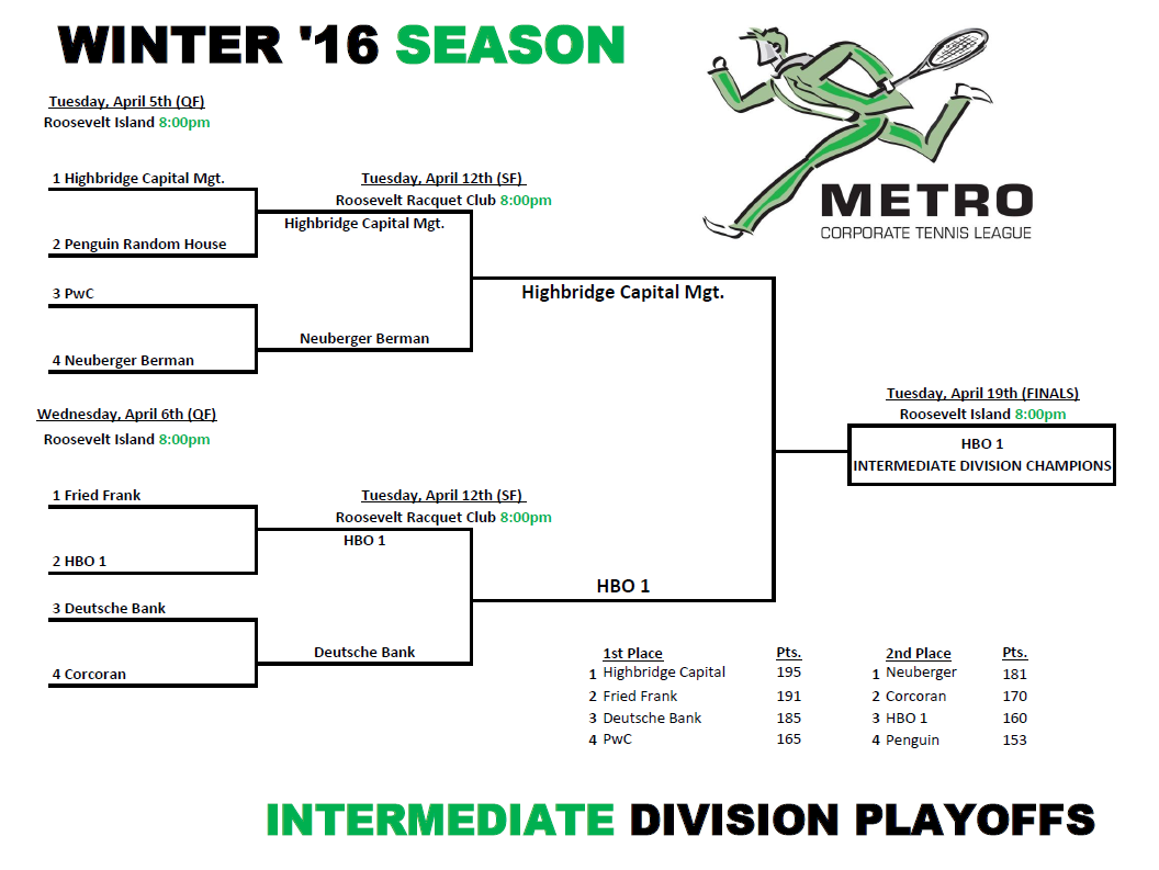 The Intermediate Division played their finals and celebrated the season at Roosevelt Island Racquet Club, where team HBO faced a strong, up and coming Highbridge Capital Management team and came out on top to win the Intermediate Division Championship.