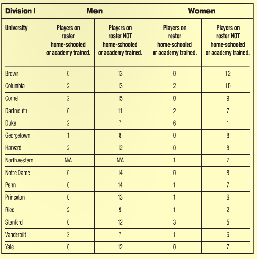 “They tend to integrate into the team environment a touch better, and they seem a little better-equipped to handle the work load and class time commitments at a top academic school,” said Schwartz. “They also are sometimes better-equipped to handle not being able to train six hours a day whatever time of day the mood strikes them to play. They are better-equipped to deal with very specific time constraints on their training. That being said, players who are online or home school-educated are perfectly capable of being tremendous teammates and students.” Schwarz does note that online schools are providing more rigorous course loads than ever.