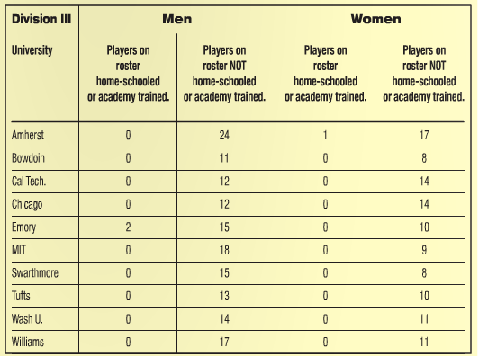 Division III schools don’t have as many home-schooled kids on their rosters. I wouldn’t necessarily assume that Division III is any more anti-home-school than D-1 schools are. I think that most kids who were home-schooled want the more rigorous tennis programs that Division I schools provide.