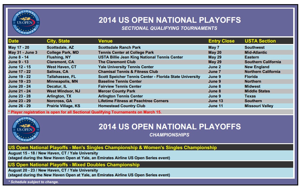 Registration opens on Saturday, March 15, at www.USOpen.org/NationalPlayoffs. The entry fee for each of the sectional qualifying tournaments varies this year, with men’s and women’s singles entries ranging from $75-$100 per player and mixed-doubles entries ranging from $45-$60 per player. All players competing must have a current USTA membership valid through Aug. 25, 2014.