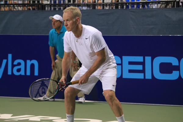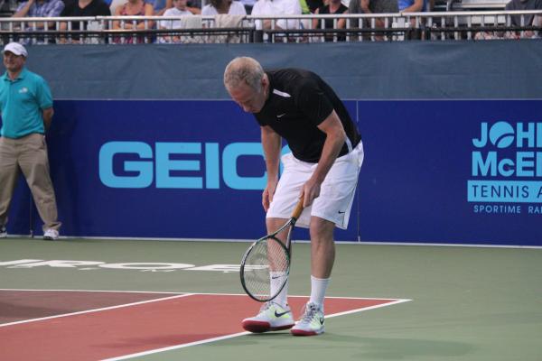 John McEnroe checks a spot after a questionable call during the men’s doubles match