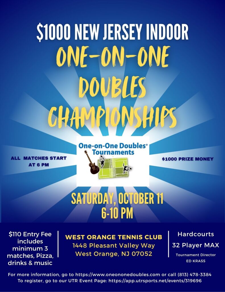 The New Jersey One-On-One Doubles Championships will take place from 6:00 – 10:00 p.m. with $1,000 prize money on the line. The tournament is played in a round-robin format where each player is guaranteed a minimum of three matches.