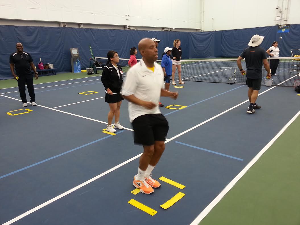 Coaches trying to keep up with the instructors during a footwork drill at the USTA Player Development Team USA Early Development Camp Coach Training workshop