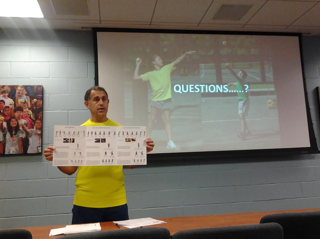 With our new knowledge, we followed Kirk and Jeff onto the courts to put our skills into practice. A neutral observer watching us learn a different method of teaching children to serve may have asked, “What the ‘L’ is going on?” The new technique is to have children hit the serve as if they were throwing a ball. The “L” is the angle made by the upper and lower arm as the student strikes the ball. This new method might be the obituary for phrases like “scratch your back” and “elbow high to the sky.”