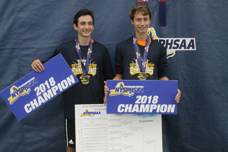 In the doubles final, the top-seeded pair of Charlie Levinson and Connor Aylett of Mamaroneck came back from a set down to beat Scarsdale’s Luke Smith and Nikolay Sahakyan 2-6, 6-1, 6-4 to win the NYSPHSAA doubles title. The duo went on to defeat the PSAL Doubles Champions, Beacon’s Donovan Brown and Julian Szuper, to win the New York State Federation Title.