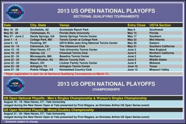 The U.S. Open National Playoffs begin as a series of sectional qualifying tournaments and will be held in 13 USTA Sections throughout the country. The 13 men’s, women’s and mixed-doubles champions or top available finishers from each sectional qualifying tournament will advance to the U.S. Open National Playoffs–Men’s and Women’s Singles and Mixed-Doubles Championship. All three championships will be held in conjunction with the New Haven Open at Yale presented by First Niagara, an Emirates Airline U.S. Open Series event.