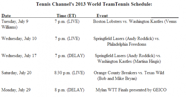 From July 7 to July 29, Tennis Channel will spotlight a 2013 WTT primetime match each week, as well as an encore of the finals tournament at the end of the season. In addition to Williams, Roddick and the Bryans, matches on Tennis Channel from this year’s WTT season will include five-time Grand Slam singles champion Martina Hingis, who will be inducted into the International Tennis Hall of Fame in July.