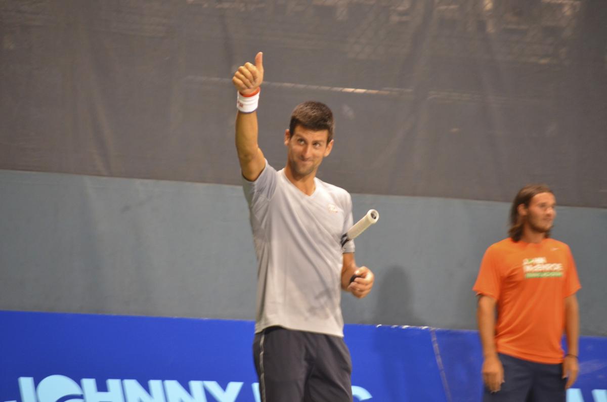 World number one Novak Djokovic gives a big thumbs up to the Sportime Randall's Island crowd