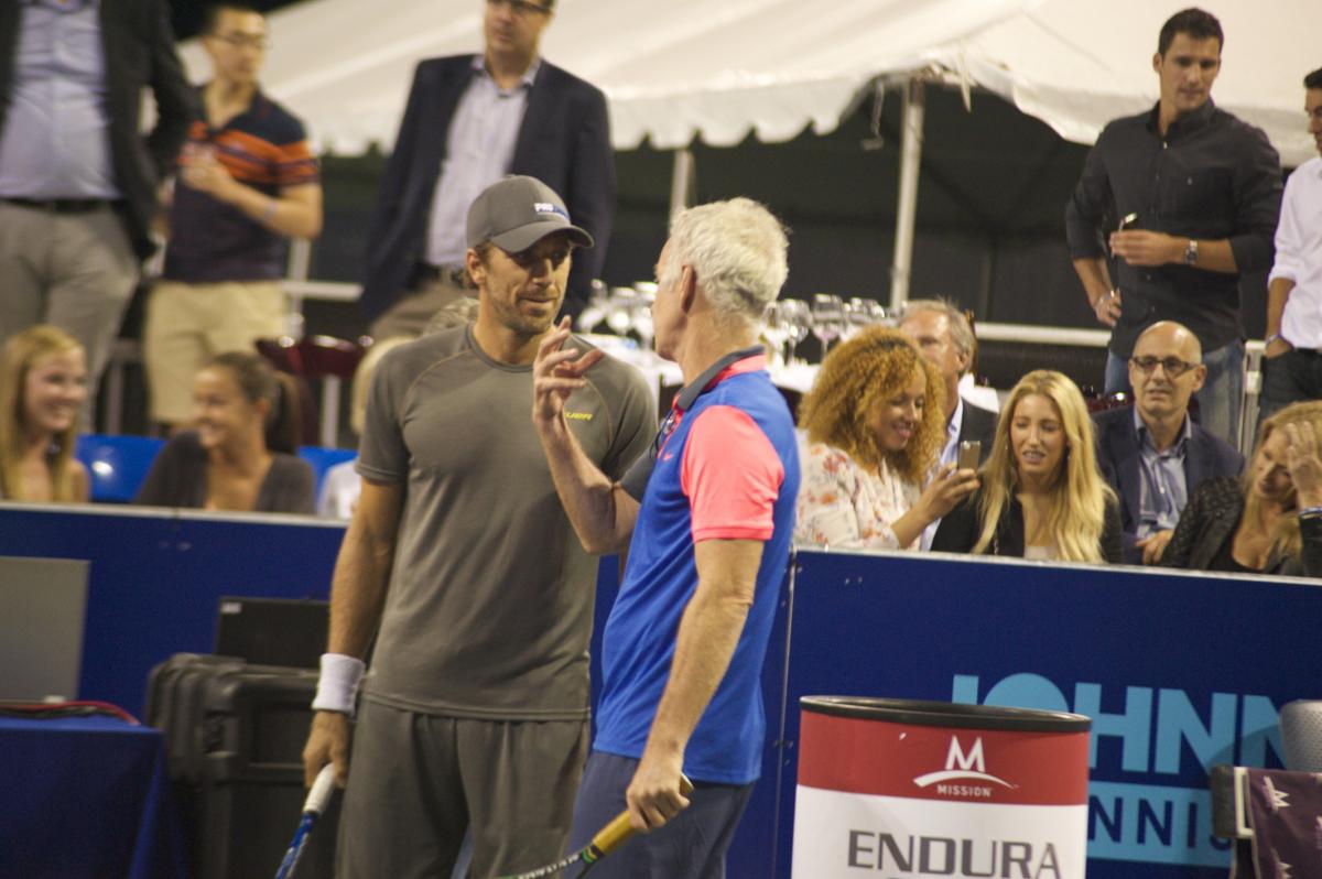 New York Rangers goaltender Henrik Lundqvist talks strategy with his doubles partner John McEnroe