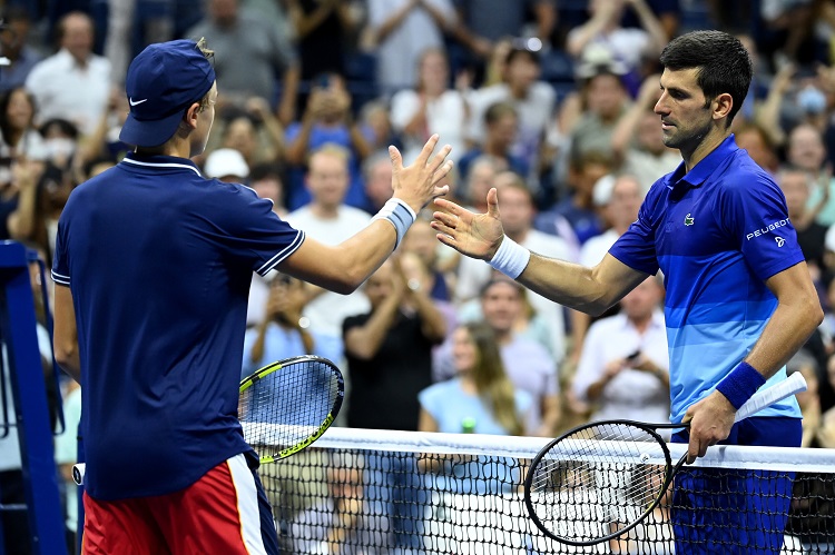 Novak Djokovic and Holger Rune shake hands after a hard-fought four-set match on Tuesday night. (Photo Credit: Garrett Ellwood/USTA)