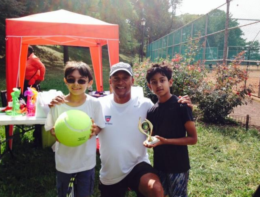 USTA Eastern Metro Region Tennis Service Representative Esu Ma’at (center) recognizes Balraj Idnani (left), winner of all five tournaments in the Orange Ball Series, and Neel Krishnaswamy (right), finalist in tournaments four and five