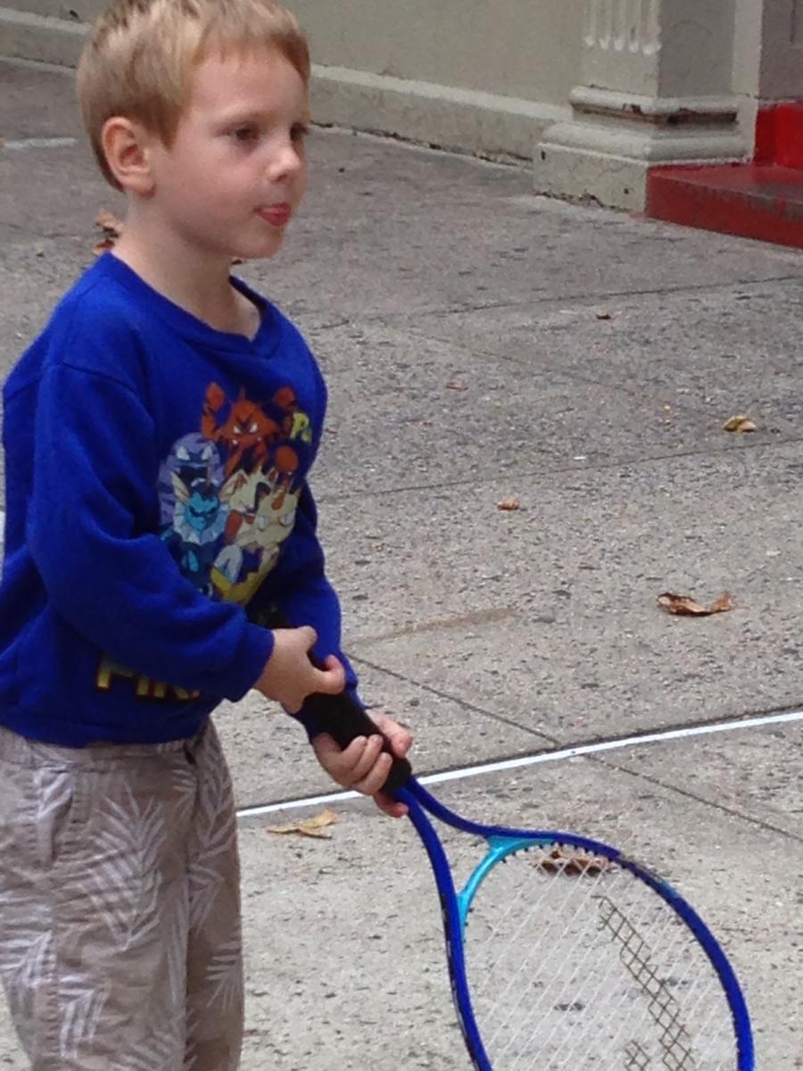 “I hit hard! Watch me!” Brandon hit a tennis ball clear across the other side of the street.