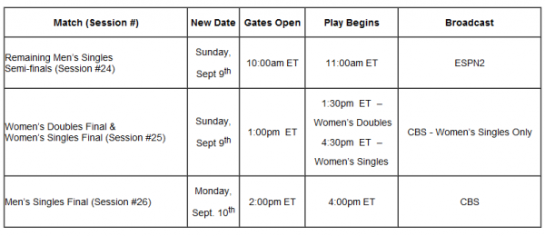 â–ºSession #26: Men’s Singles Final: The Men’s Singles Final (Andy Murray vs. Novak Djokovic or David Ferrer) is rescheduled for Monday, Sept. 10th at 4:00 p.m. ET (gates open at 2:00 p.m. ET).