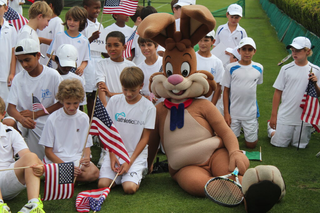 With Nesquik as the presenting sponsor, this tournament looks to already be a huge success, as the players arrived on Sunday for a tour of the grounds and the first couple hours of practice on the courts to get used to the Clay. After observing the grandeur of the former site of the U.S. Open, the boys and girls gathered on the grass courts in front of the West Side clubhouse for the opening ceremonies where all rules of play for the tournament were announced for the players and their parents. Staying in the custom of The West Side Tennis club, players were dressed in “all white” tennis gear for the ceremony as they will be for the whole tournament. The pinnacle of excitement unfolded as a procession led by Quiky the Nesquik bunny headed from the grass courts to the stadium court where the eager fans waited to see the spectacle. Each player held a flag representing the country that s/he hailed from, and after arriving and encircling the court a few times, the players were introduced one by one by name and hometown.